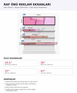 Raf önü LCD bilgi ekranları, perakende mağazalarında ürün raflarının ön bölümüne konumlandırılan ve ürünle ilgili bilgilerin dijital şekilde sunulmasını sağlayan yüksek çözünürlüklü ultra stretch ekran çözümleridir.